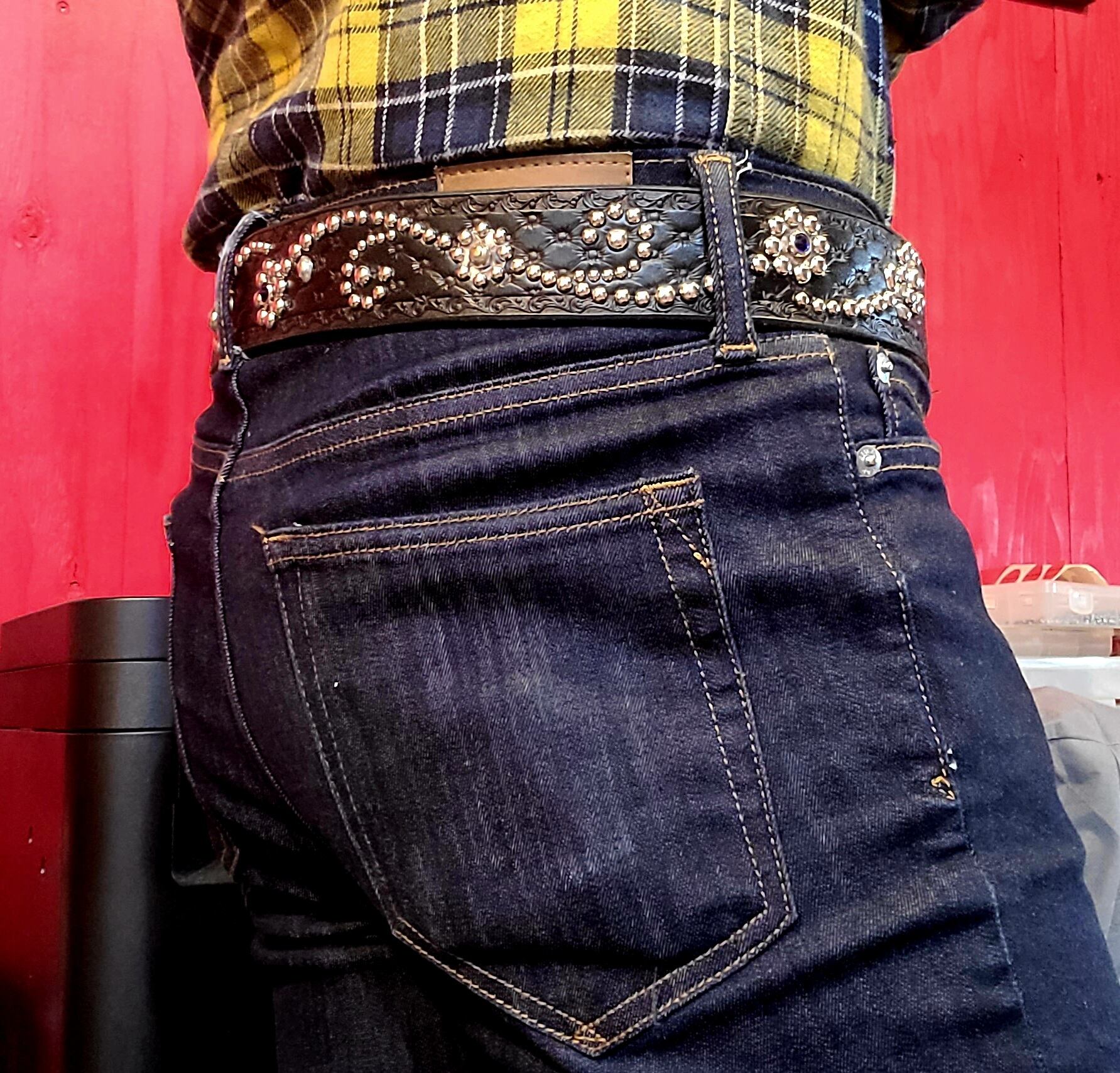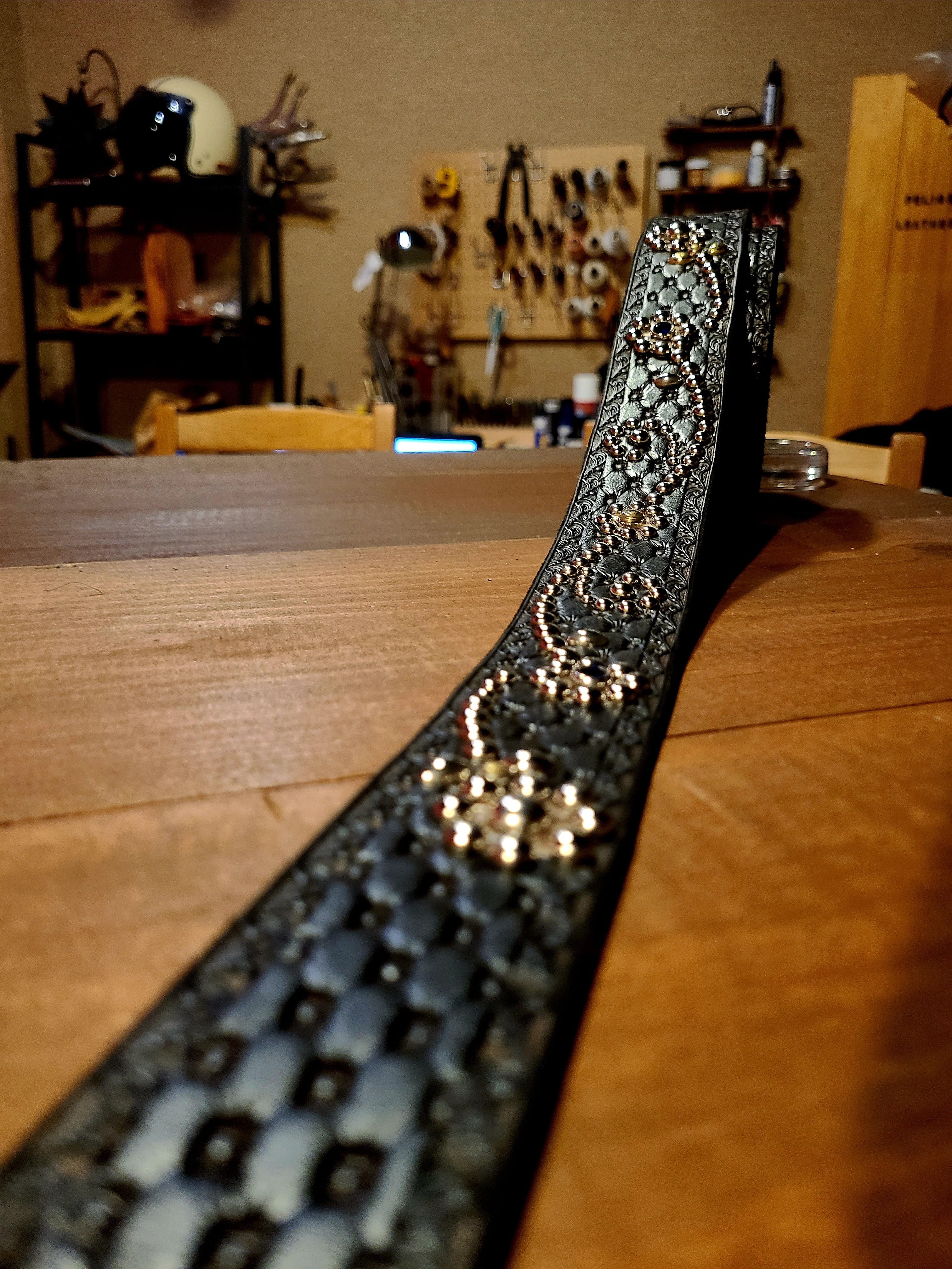 ベルト全体に施されたソファ柄のスタンピングとスタッズワークが、腰回りを優雅に彩ります。細かい部分にもパイソンを使用、スタッズには細かい彫刻が施され、より一層高級感が漂います。